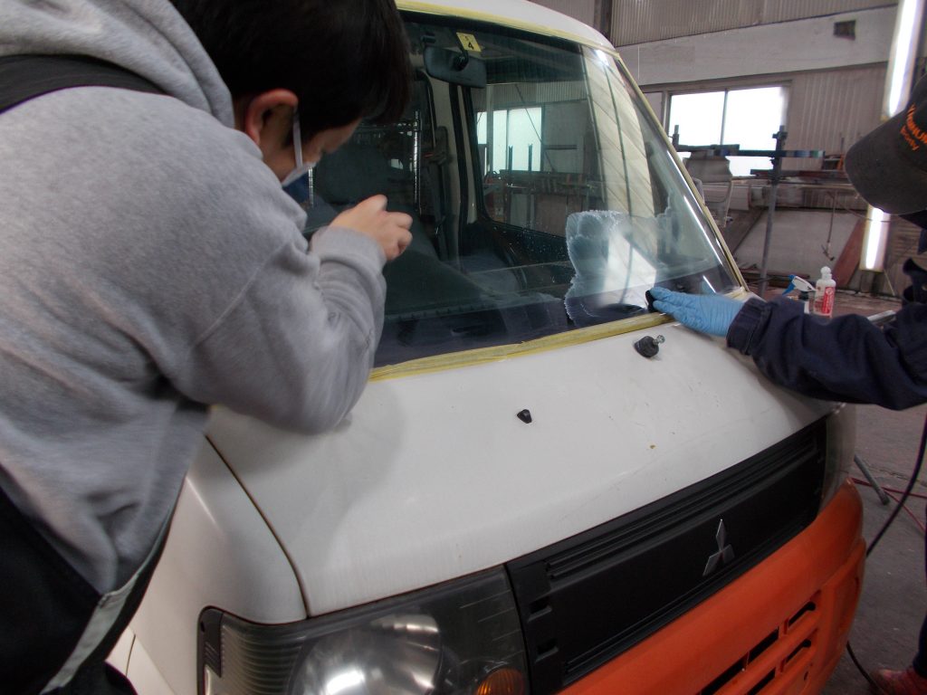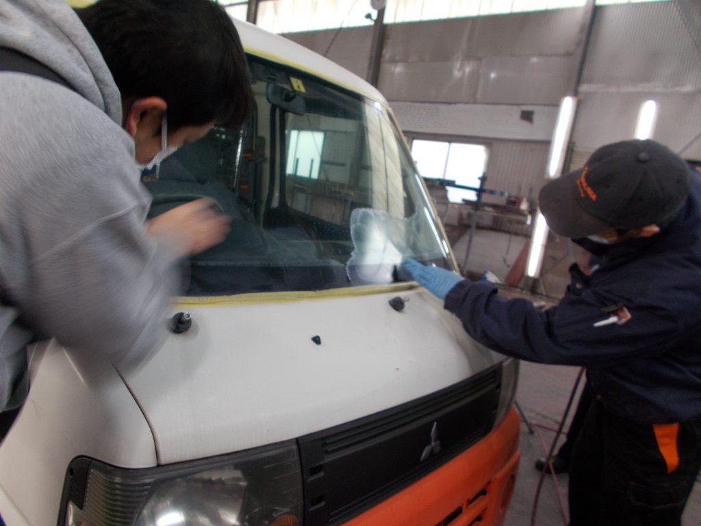 落ちにくい水垢に使用するガラス研磨剤をフロントガラスに塗り
