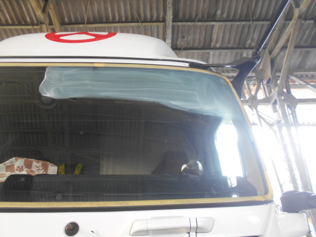 ガラス研磨剤にてフロントガラス表面を研磨していきました。