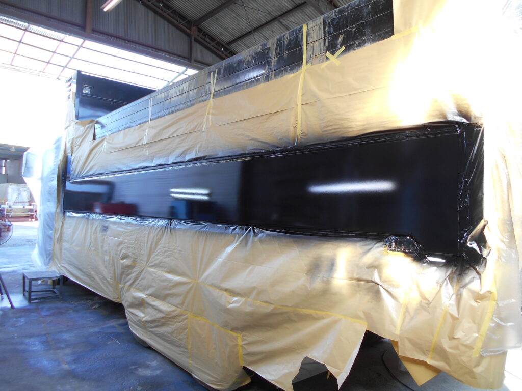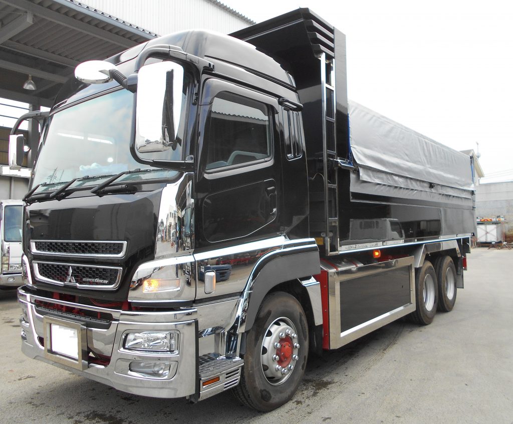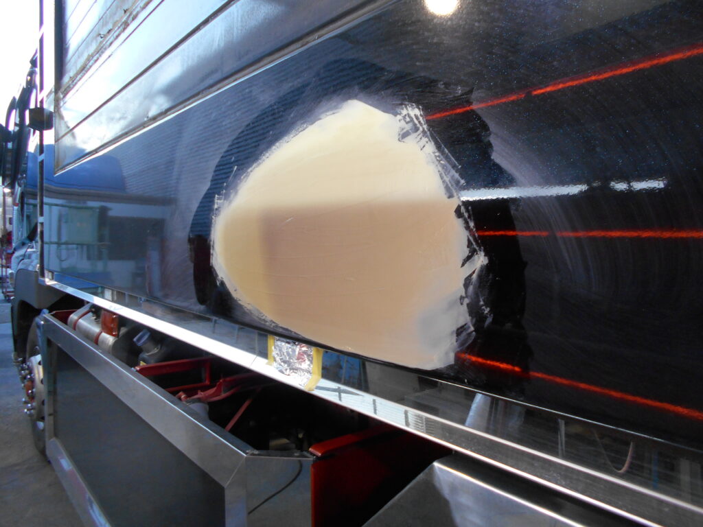 大型ダンプトラックの事故修理で荷台のサイド部分を板金塗装しました。型式はQKG-FV50でした。
