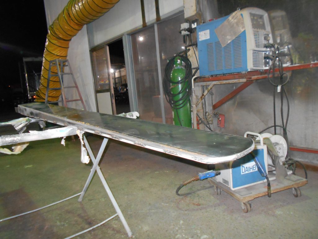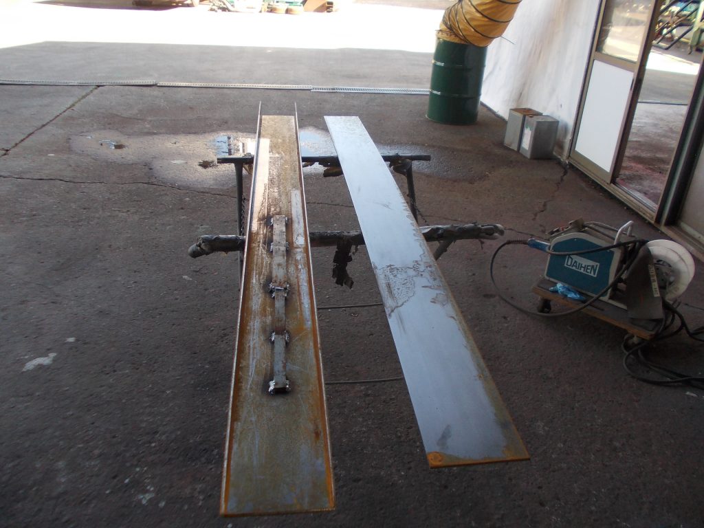 シャーリング加工した底面の蓋を溶接しました。溶接は荷重がかかった時にアタッチメントのしなりを考慮して200mmの間隔であけて、50mmずつ溶接していきました。先端部分はアールに切断した後に、先端部分は全周溶接しました。