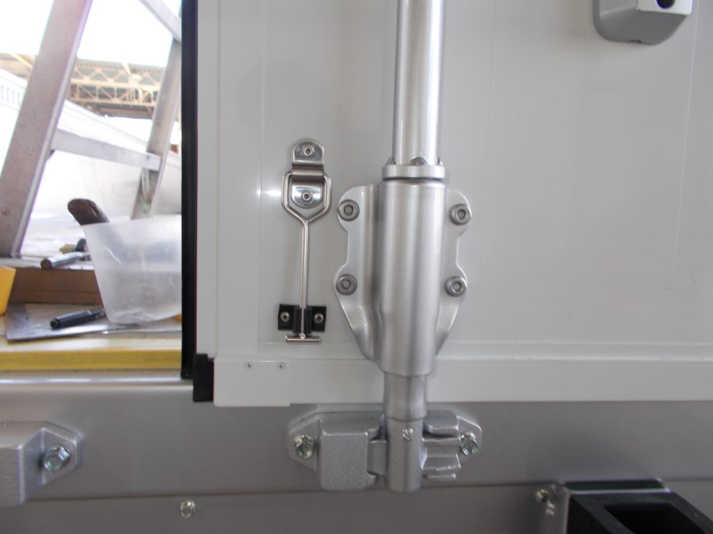 軽量幌ウィング車を製造するにあたり、4t車で少しでも積載量を取りたいというお客様の要望にお応えするため、費用対効果と今後のことを考えリヤトビラをすべて中空アルミ材に変更しました。