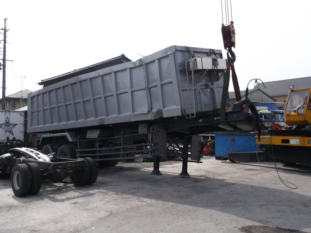 トラックを修理するにあたりトレーラーダンプの積載部分とフレームを分離して修理しました。