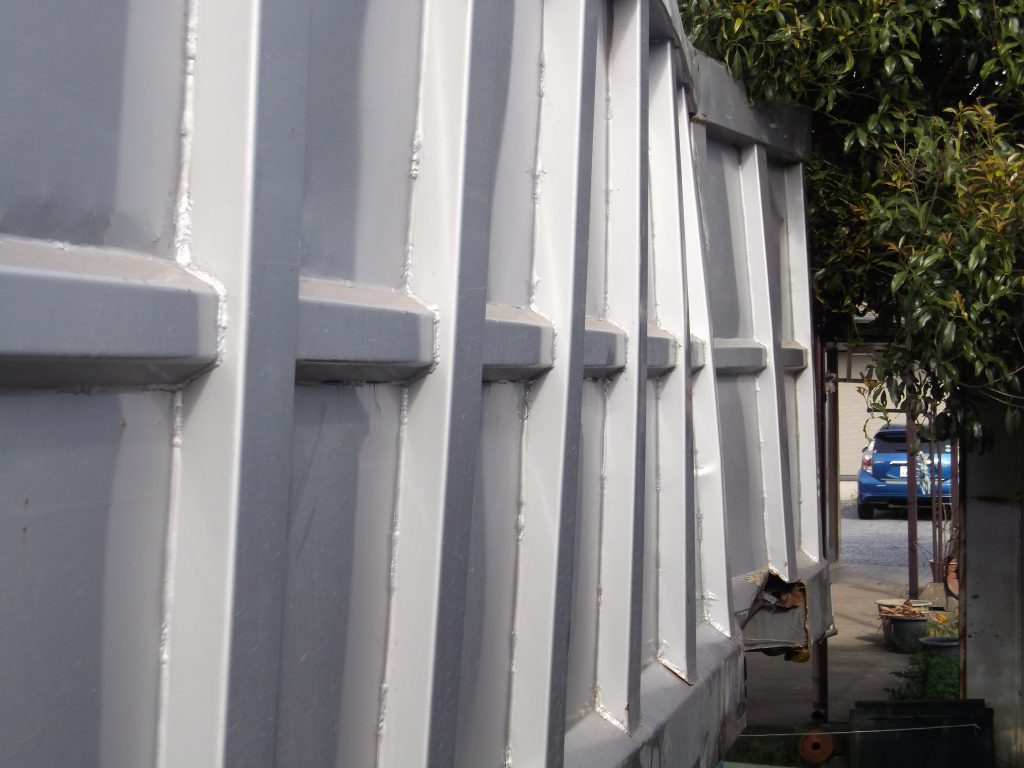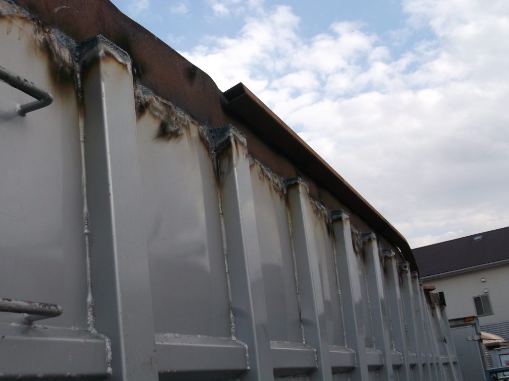 ダンプのリヤトビラ左上部を確認すると歪みが確認できました。トラックの修理ではこのようなところも確認して修理をしていきます。