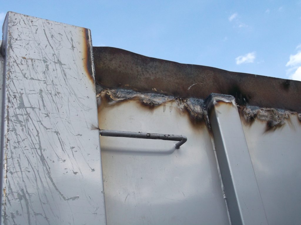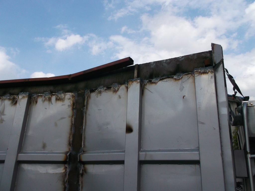 トレーラーダンプを作業しやすい場所に移動ました。トラックのリヤゲート部分を見ると柱の歪みとリヤのデートの歪みが確認できました。