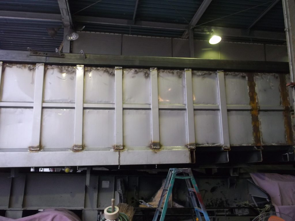 トレーラーダンプの下側外板骨格を取り付けたところです。前方のチェーンは溶接時に歪みを防止するためにつけています。